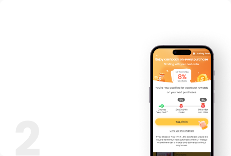 8% cashback on all subsequent purchases starting from the 5th order